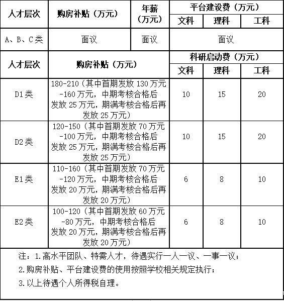 (一)各类人才除享受按国家有关规定提供的工资、保险、福利待遇外,学校还提供其他优厚待遇,详情可参考表2。